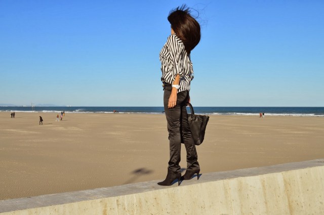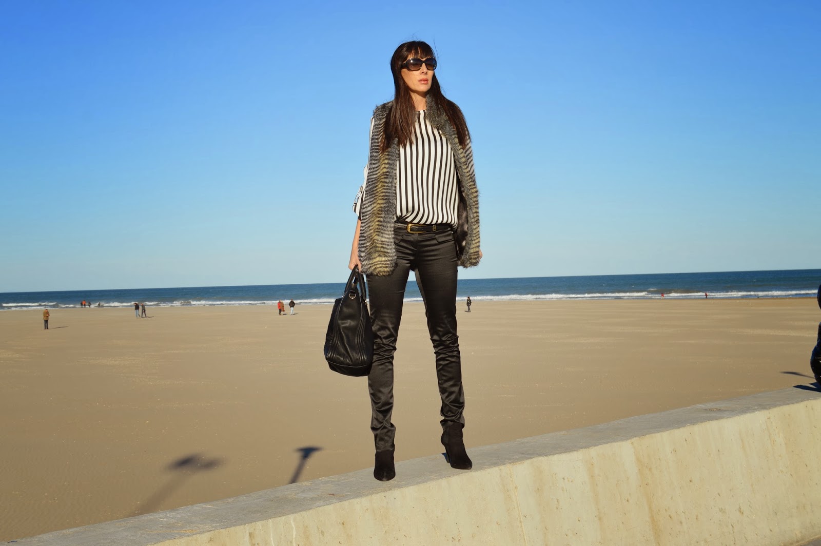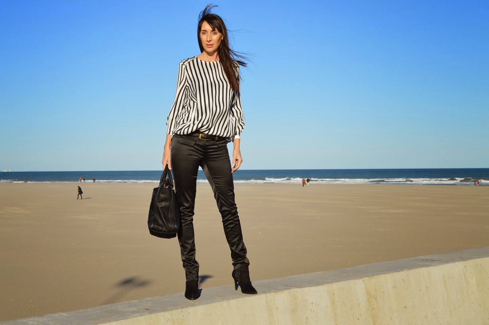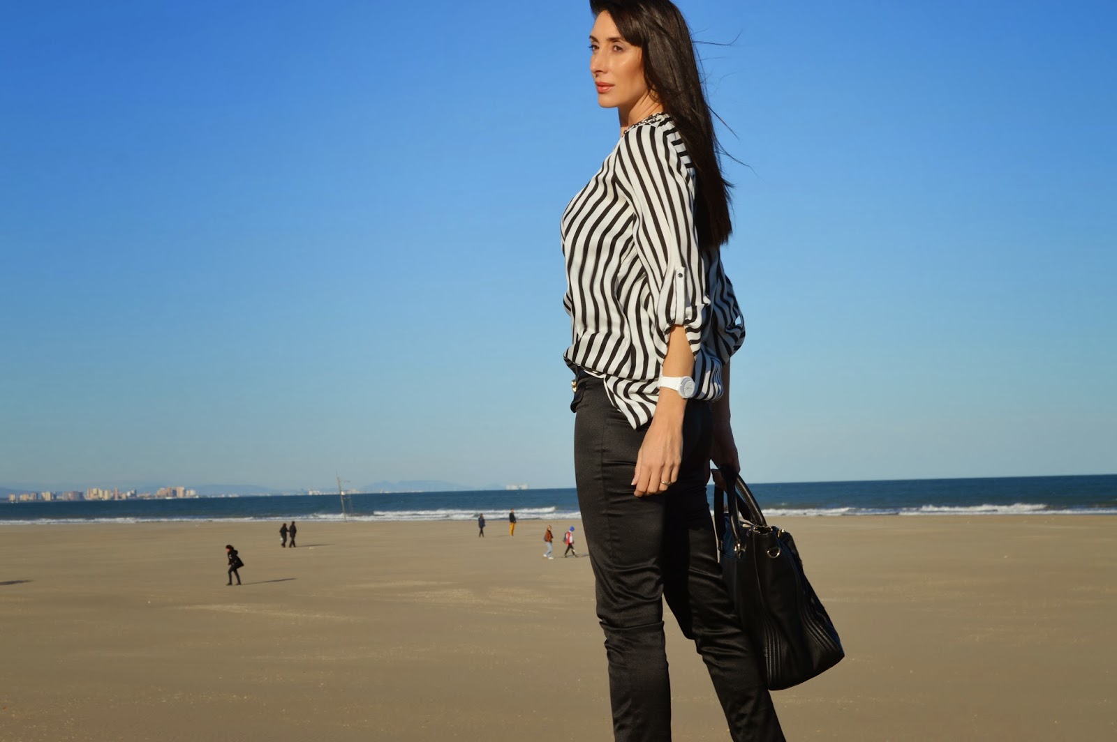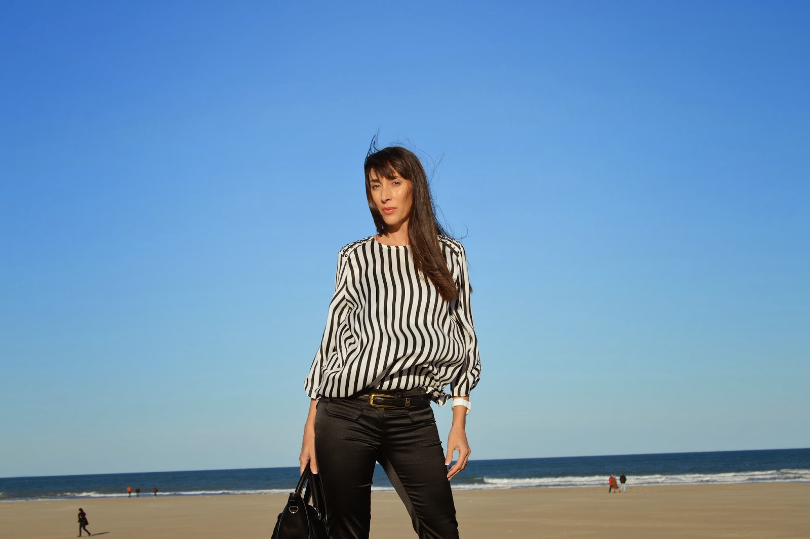 El viento en la playa… ¡qué dífícil es hacer fotos con viento!, pero fue divertido y me apetecia mucho enseñaros este outfit, hacia tiempo que buscaba esta camisa en blanco y negro con rayas verticales, la encontré de casualidad en Mango, era la única que había en esa tienda. La he combinado con este pantalón negro brillante que tengo desde hace mucho.