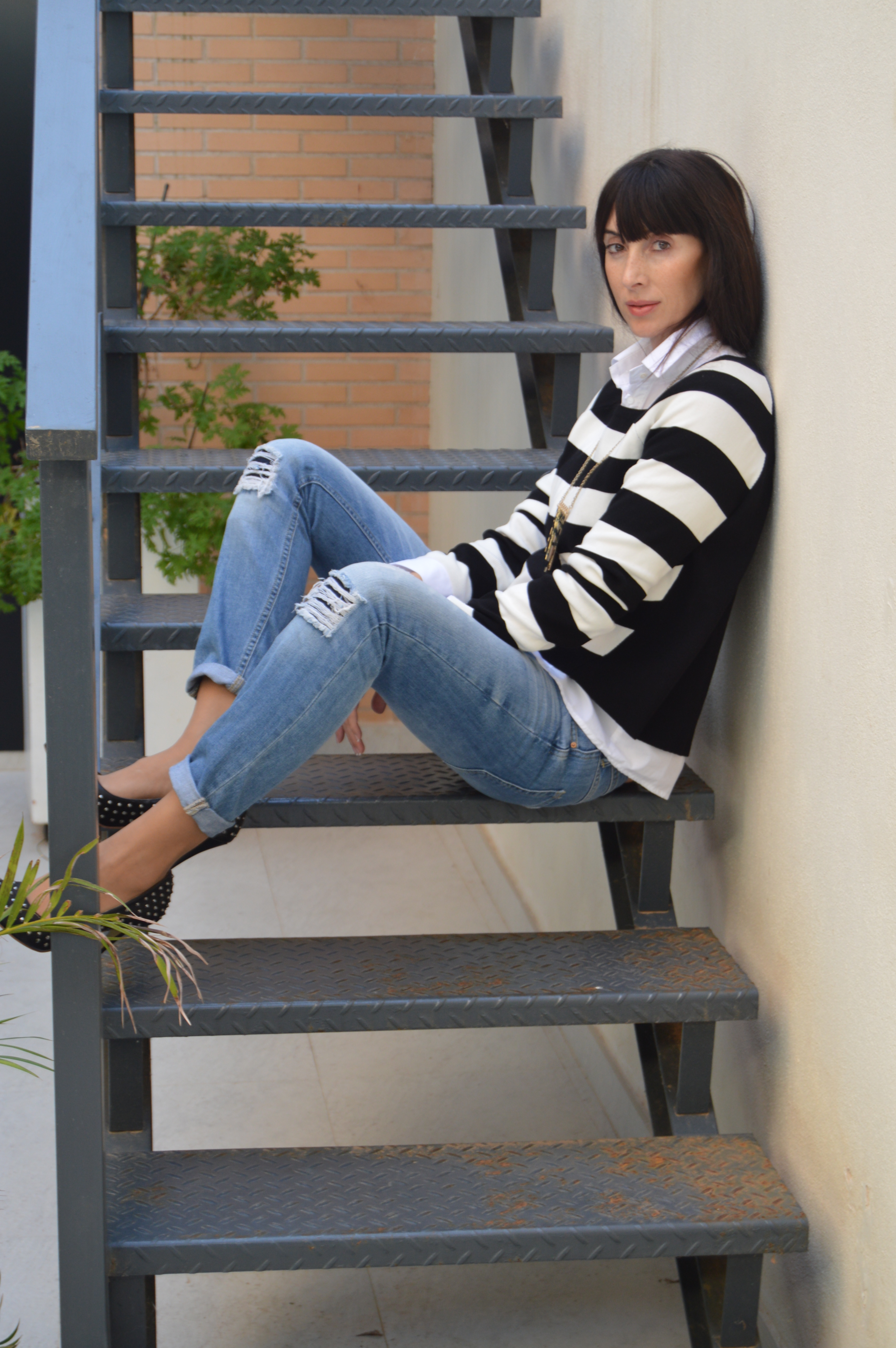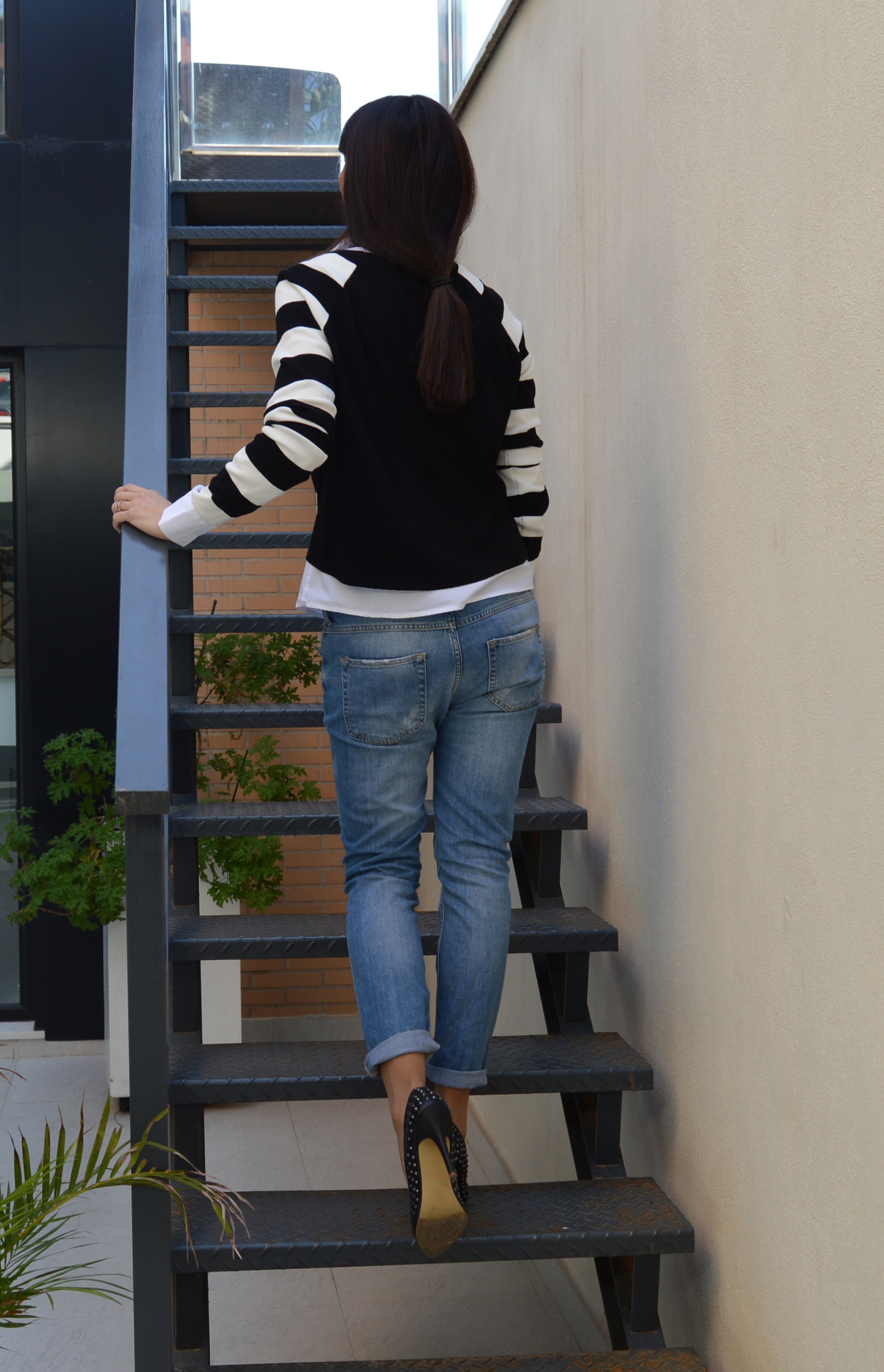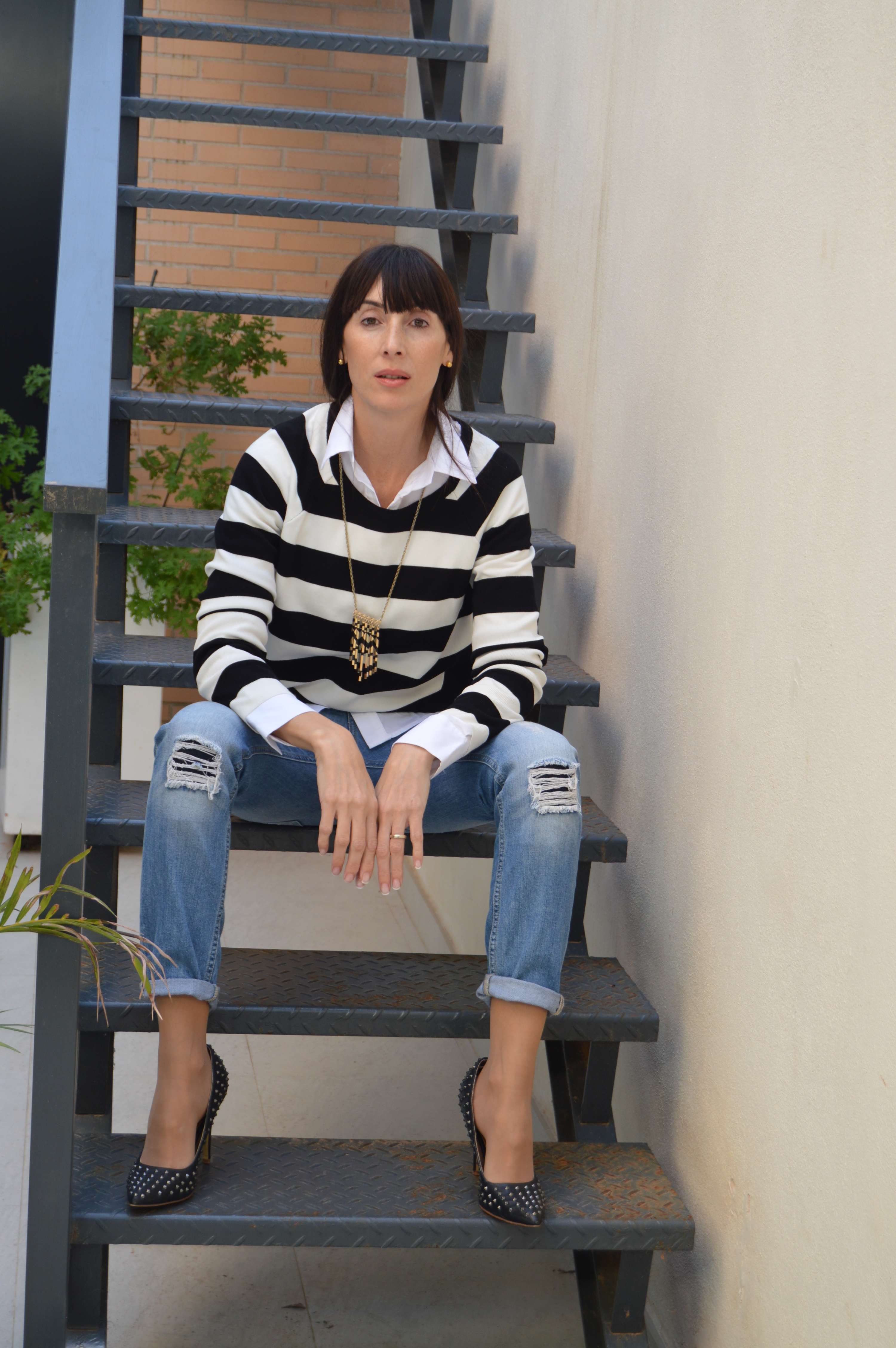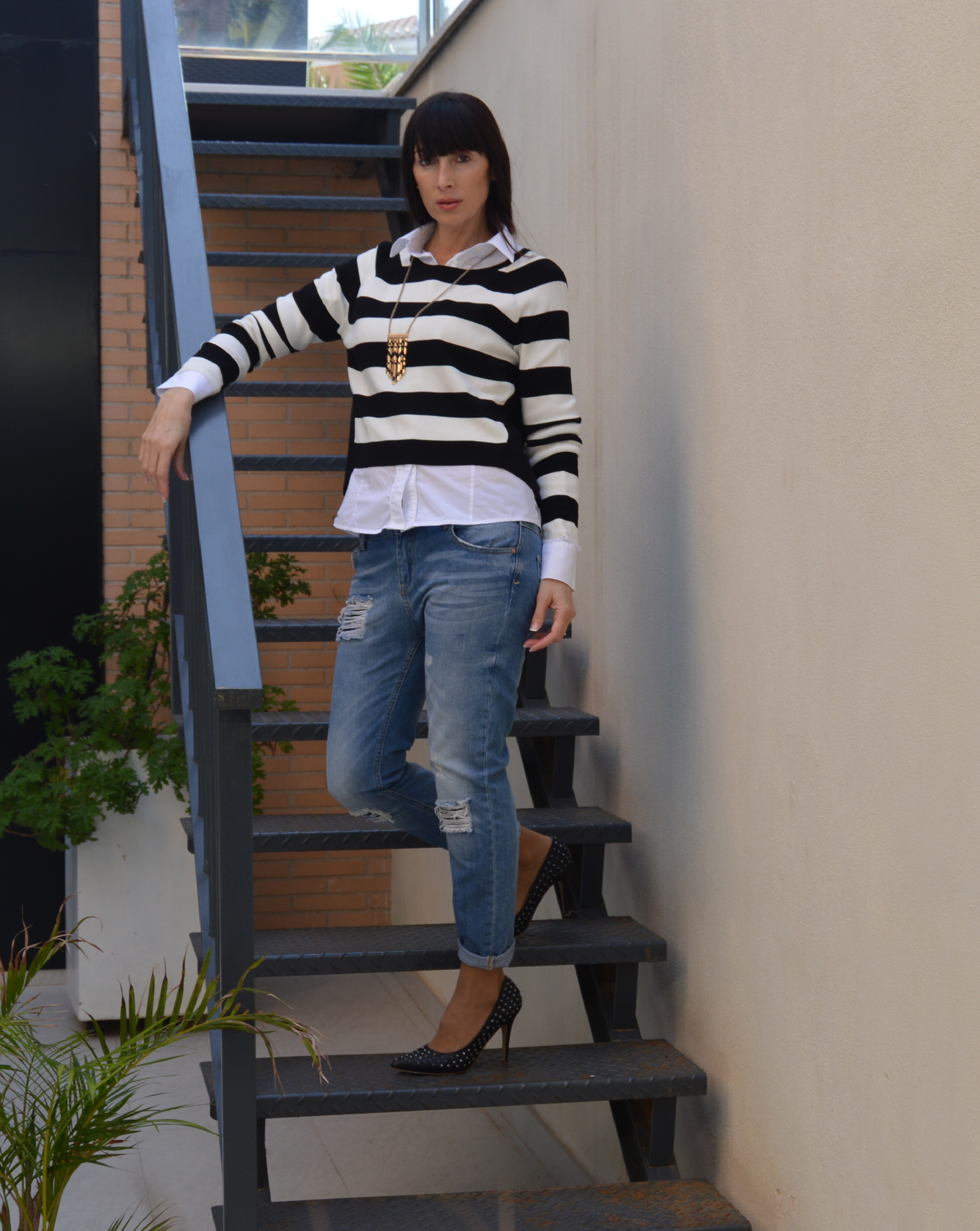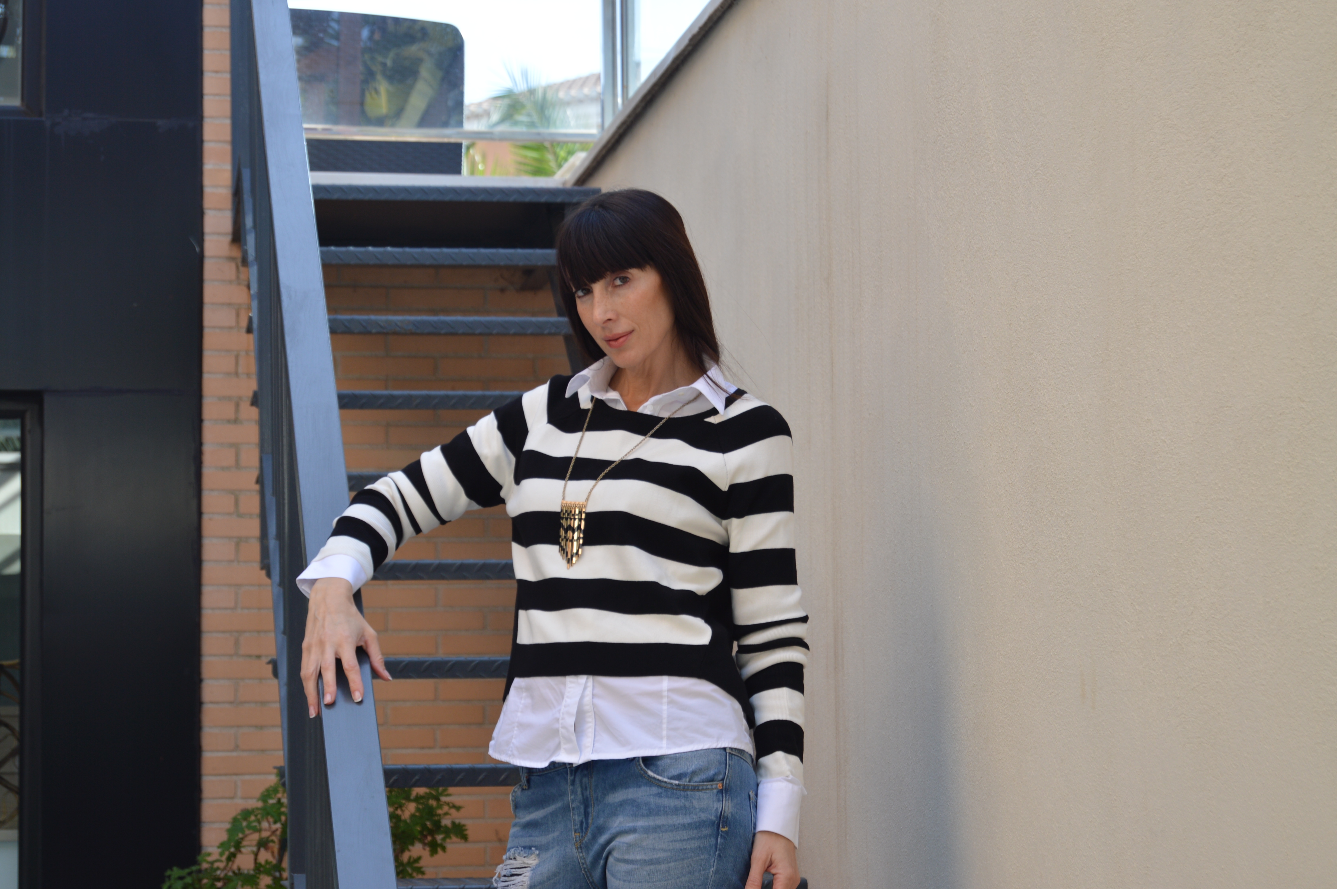 En la parte de arriba le he añadido camisa blanca y sueter black and white a rayas horizontales.