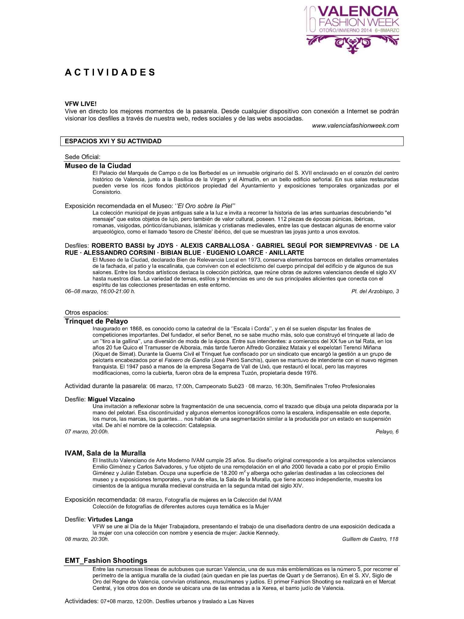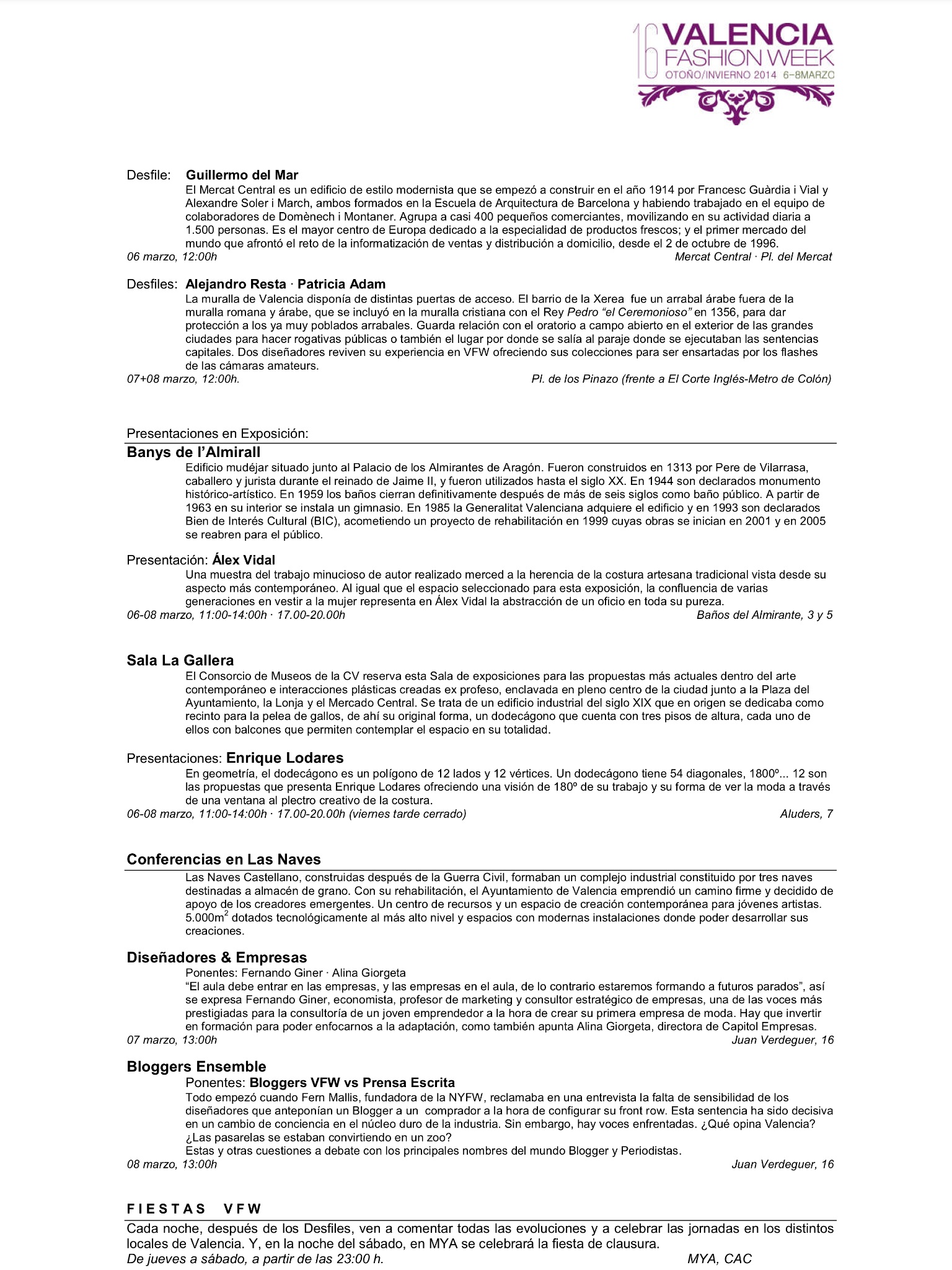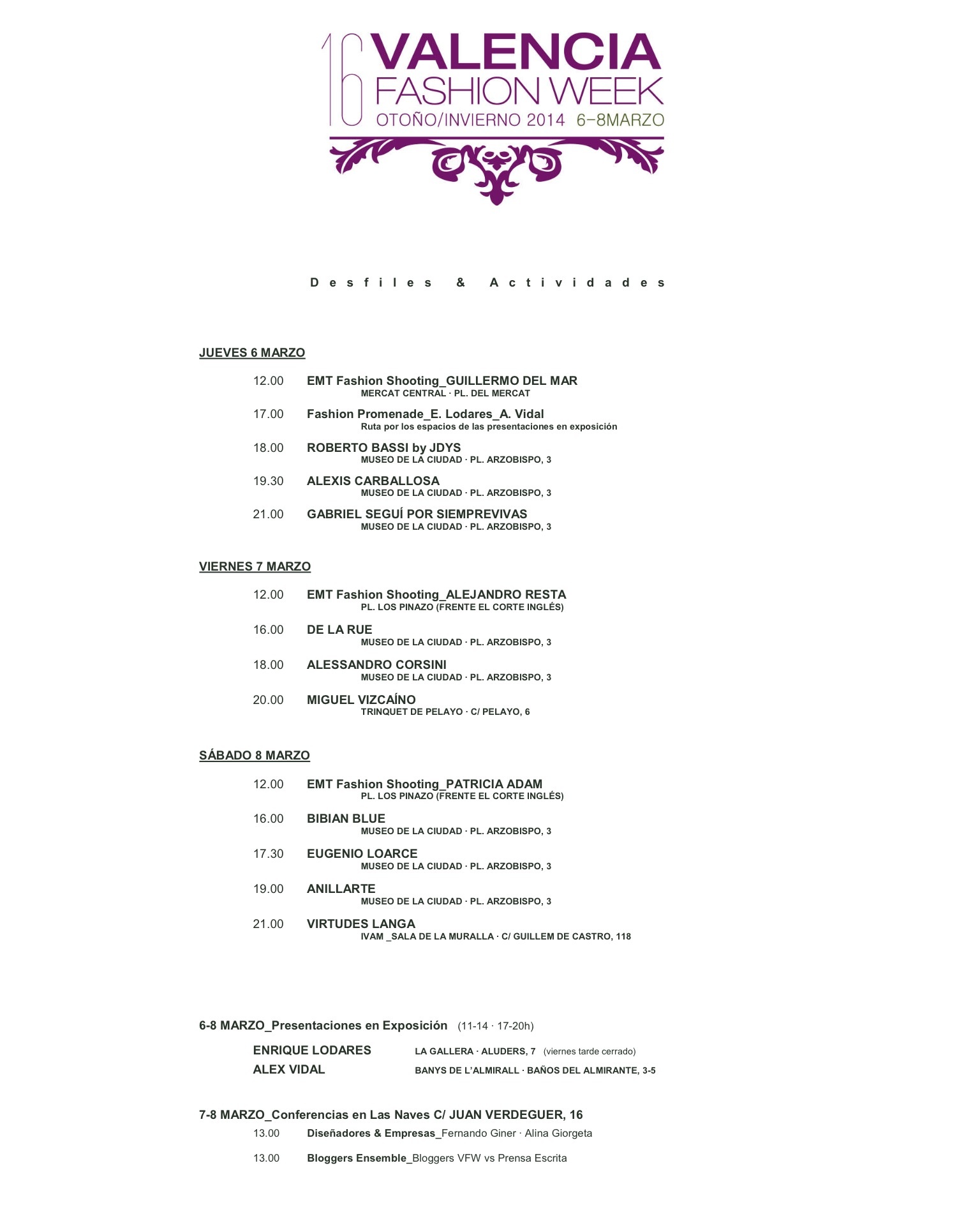 El programa de esta XVI edición de la Valencia Fashion Week no acaba aquí puesto que se ofrecen otras actividades como exposiciones, encuentros y conferencias, un amplio abanico de posibilidades para disfrutar de la moda. Como novedad, la VFW se traslada con la línea 5 de la EMT para realizar loa EMT- FASHION SHOOTINGS, en lugares emblemáticos de la ciudad para acercar, así, la moda al gran público y hacerlo participe. Los lugares elegidos será El Marcado Central y La Plaza de los Pinazo donde será un lujo ver a ALEJANDRO RESTA, PATRICIA ADAM Y GUILLERMO DEL MAR.