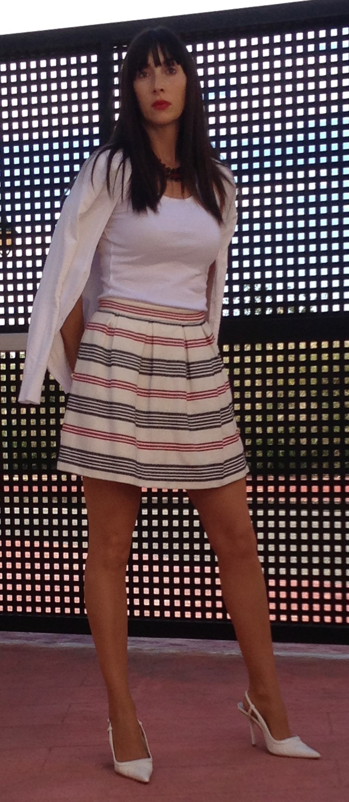 Este outfit me encanta, es tan fácil y tan luminoso, camiseta nadadora, mi falda marinera, de la que estoy enamorada, una chaqueta y a disfrutar del sol.