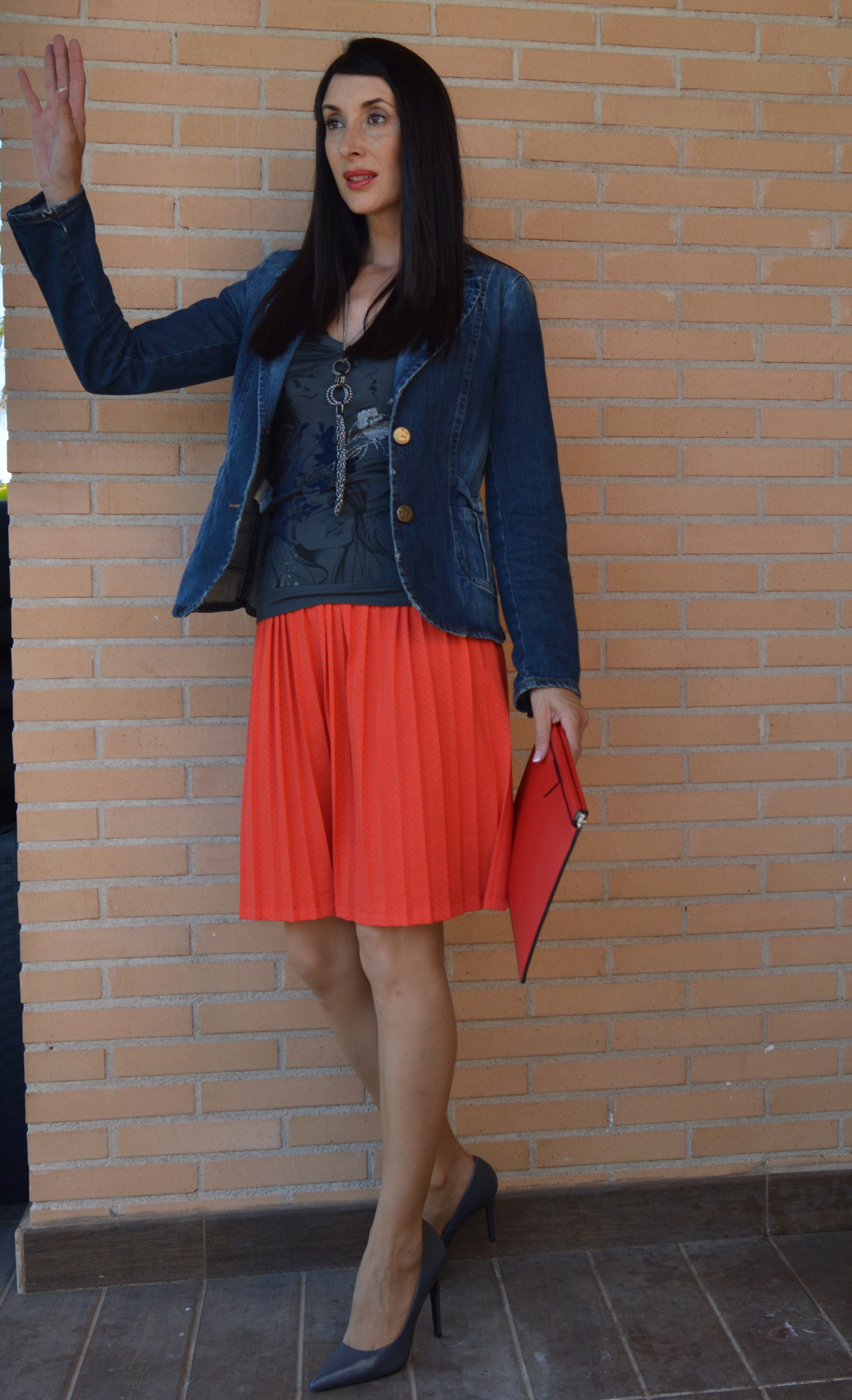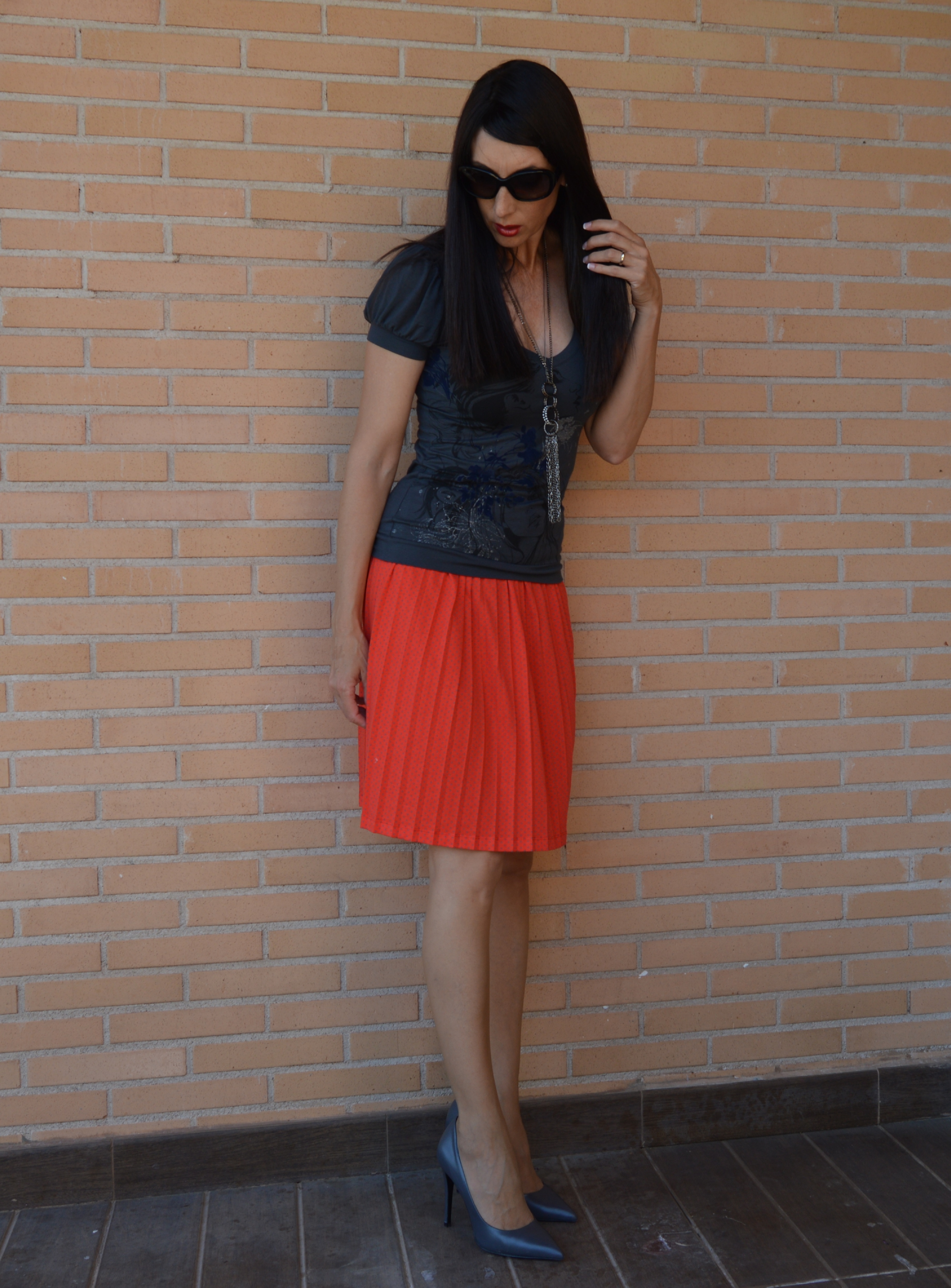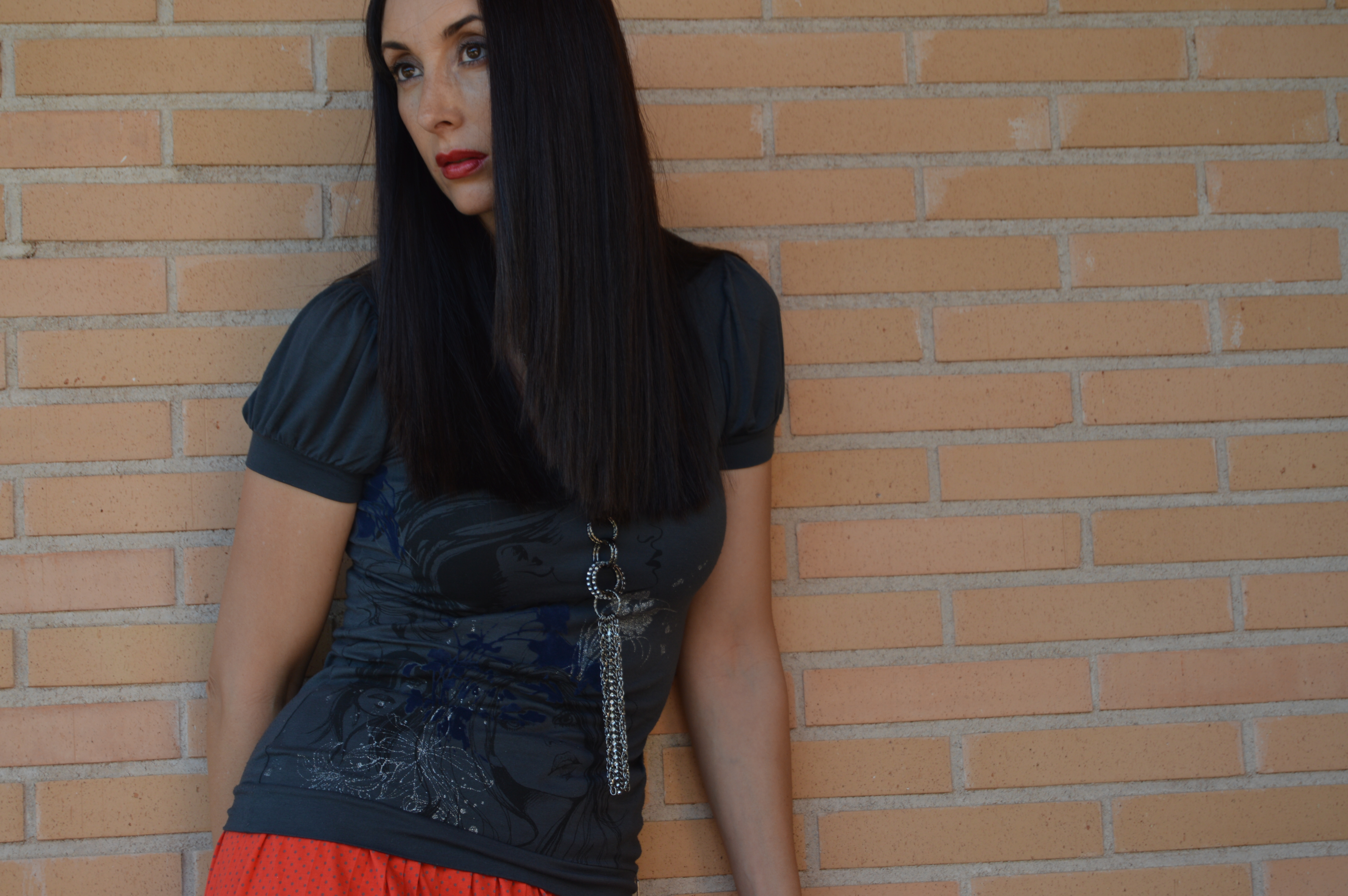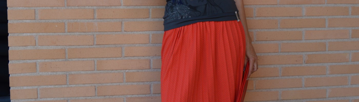 Conocía ya esta firma de ropa, Dolores Promesas y , la verdad, debo decir que me encanta. El otro día entre, de casualidad, en la tienda, y aunque suene a tópico, pasaba por allí. Al verla, fue amor a primera vista, qué bonita esta falda, roja con topitos grises. es tan ligera que parece que no vas vestida. Me recuerda mucho al estilo de faldas que llevaba mi madre cuando era joven.