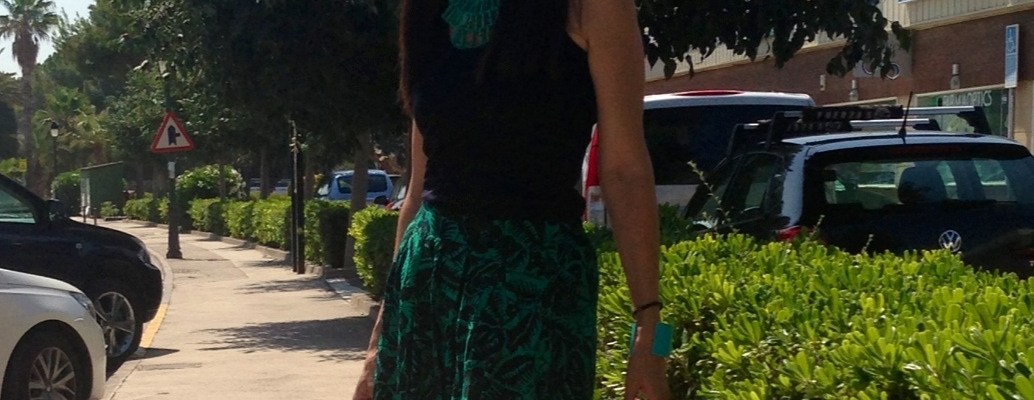 Esta falda, comprada en Stradivarius, me llamo la atención por el estampado, bastante discreto. Combinada con la camiseta nadadora le damos un toque informal. Me encantan los tacones, los stilettos pero en verano mejor cambiarlos por cuñas, que mantienen la altura pero son mucho más cómodas.