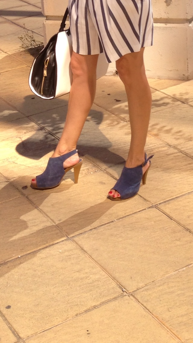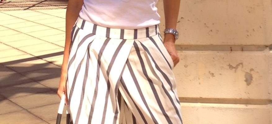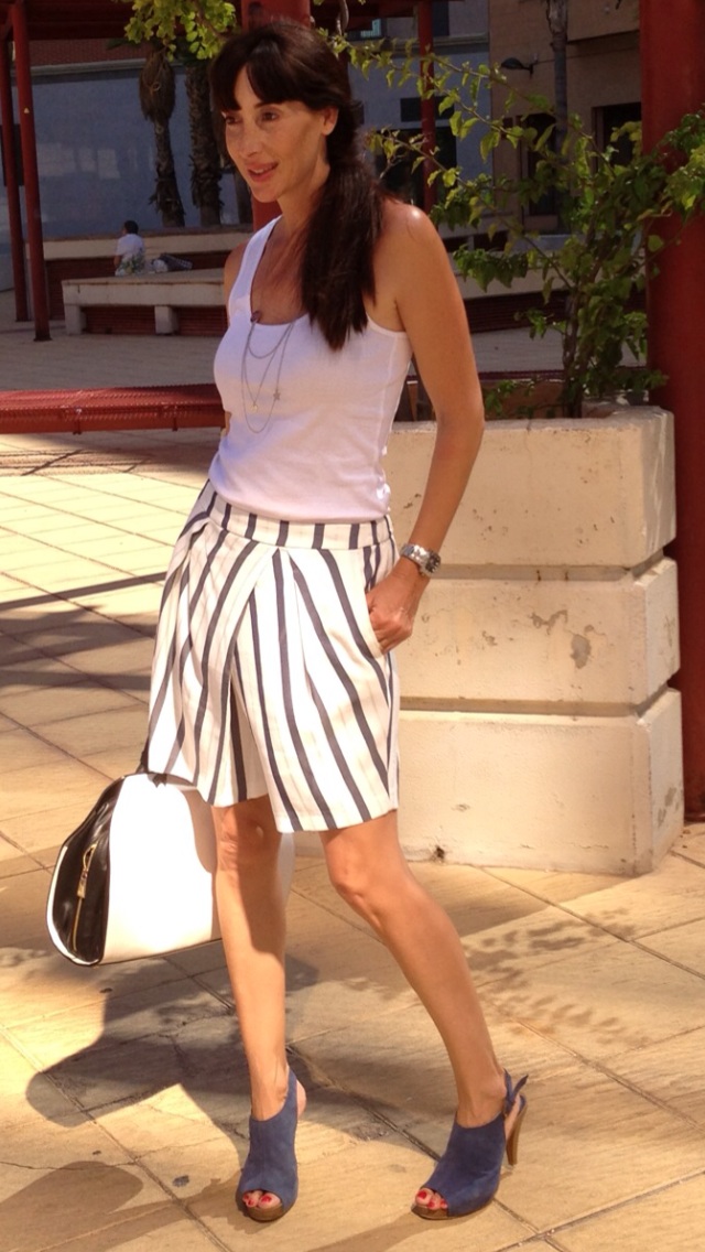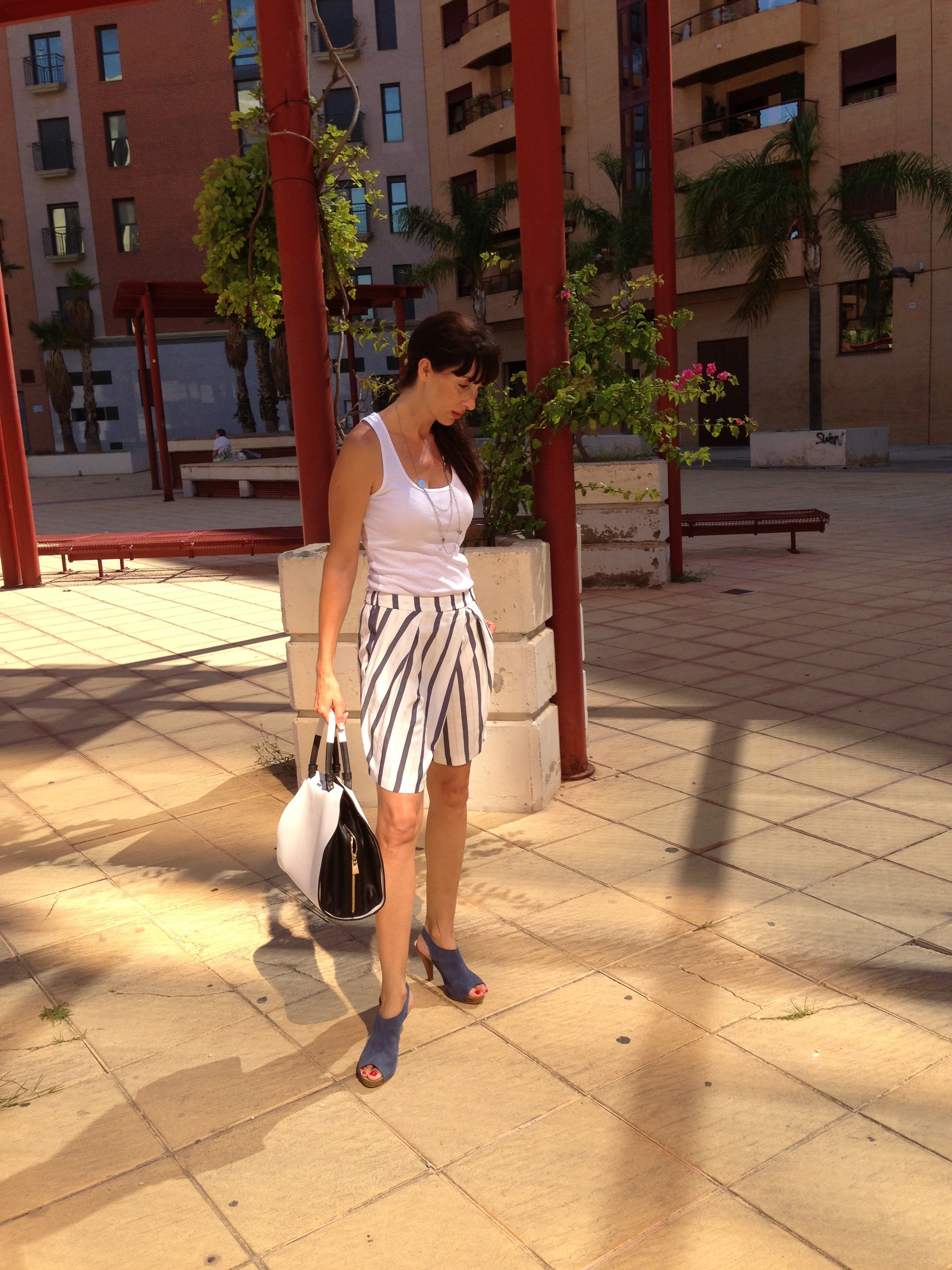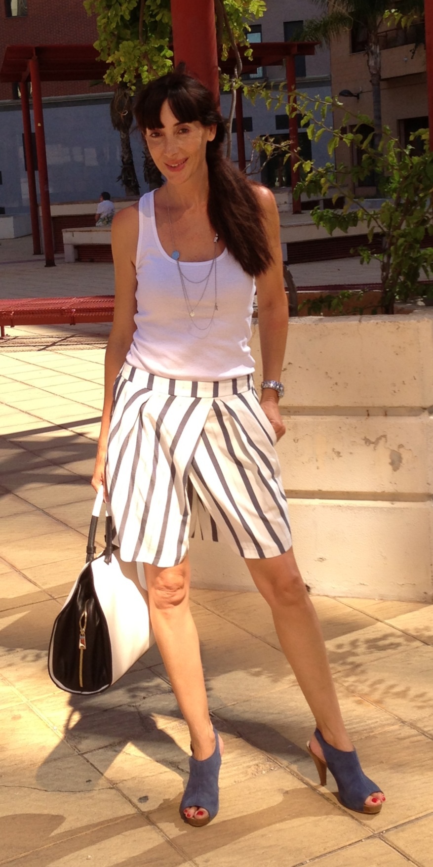 He combinado la falda pantalón con blanco y el azul de los zapatos, mi reloj, que he de confesar que no tiene pila, y un collar que me regalaron en Dior.