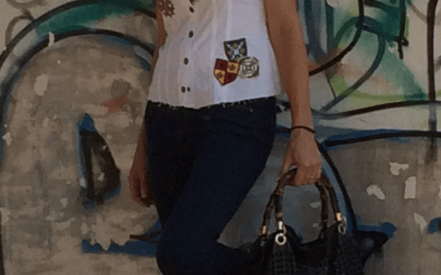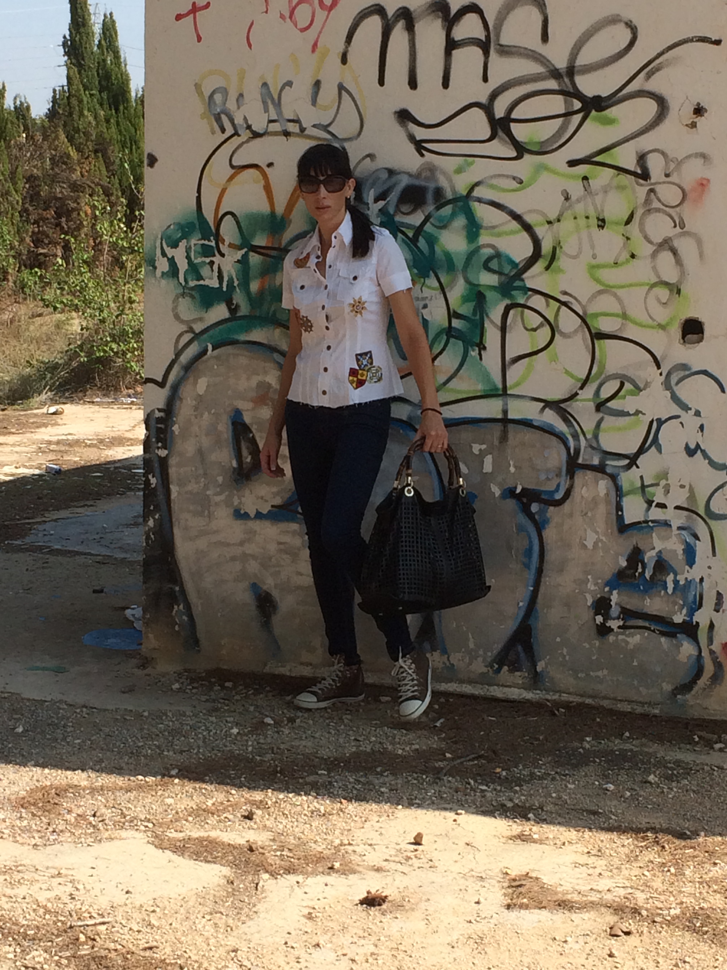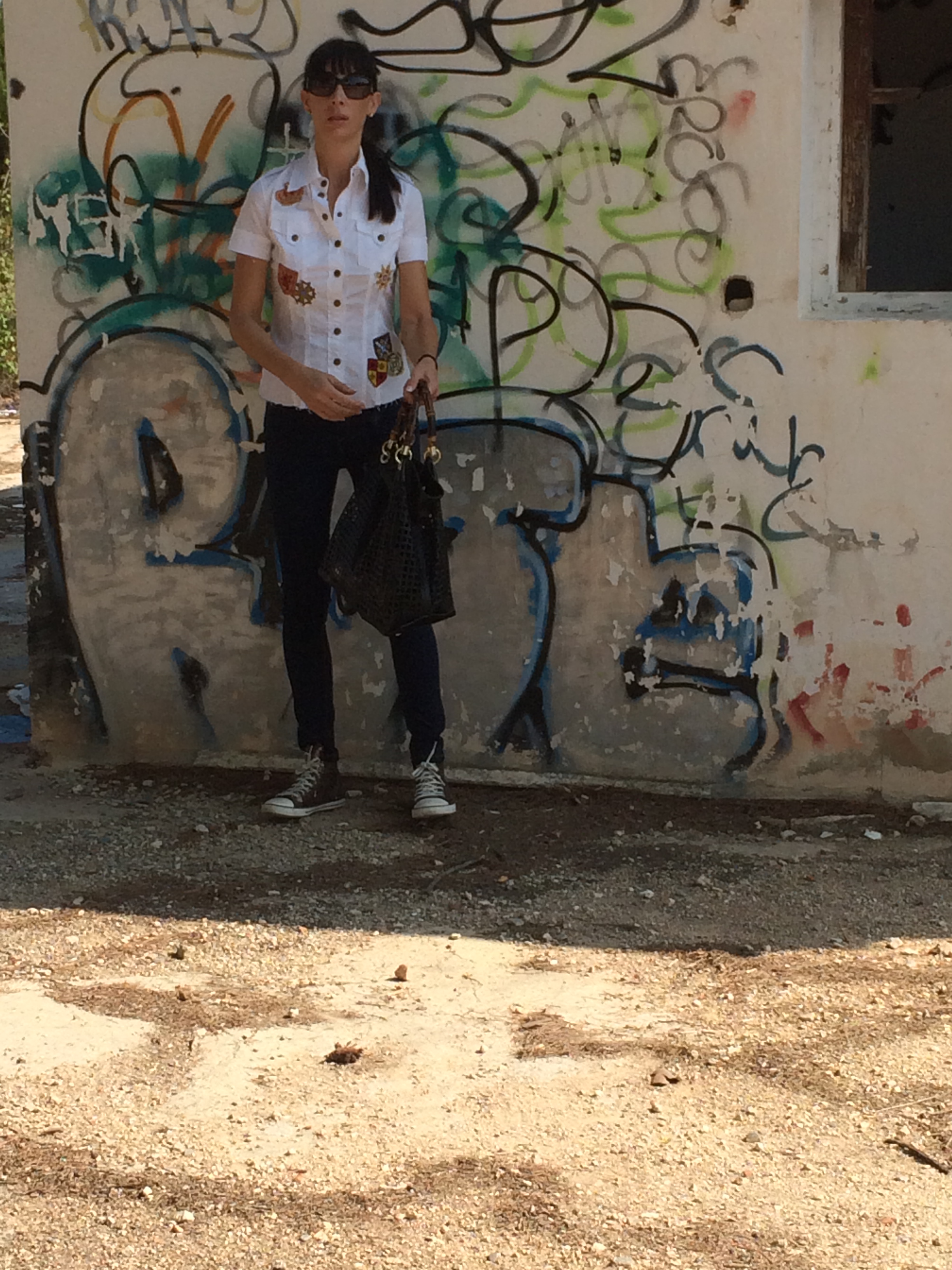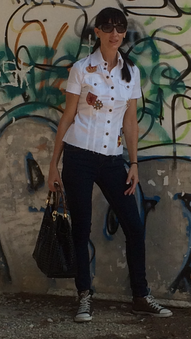 Mi look completamente informal, jeans y camisa con detalles militares, mis zapatillas brillantes y un maxibolso troquelado.