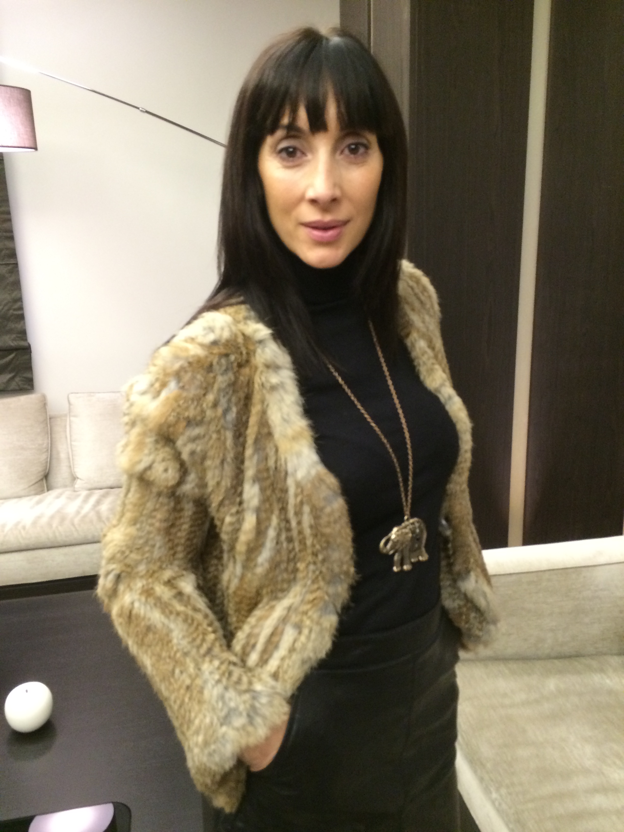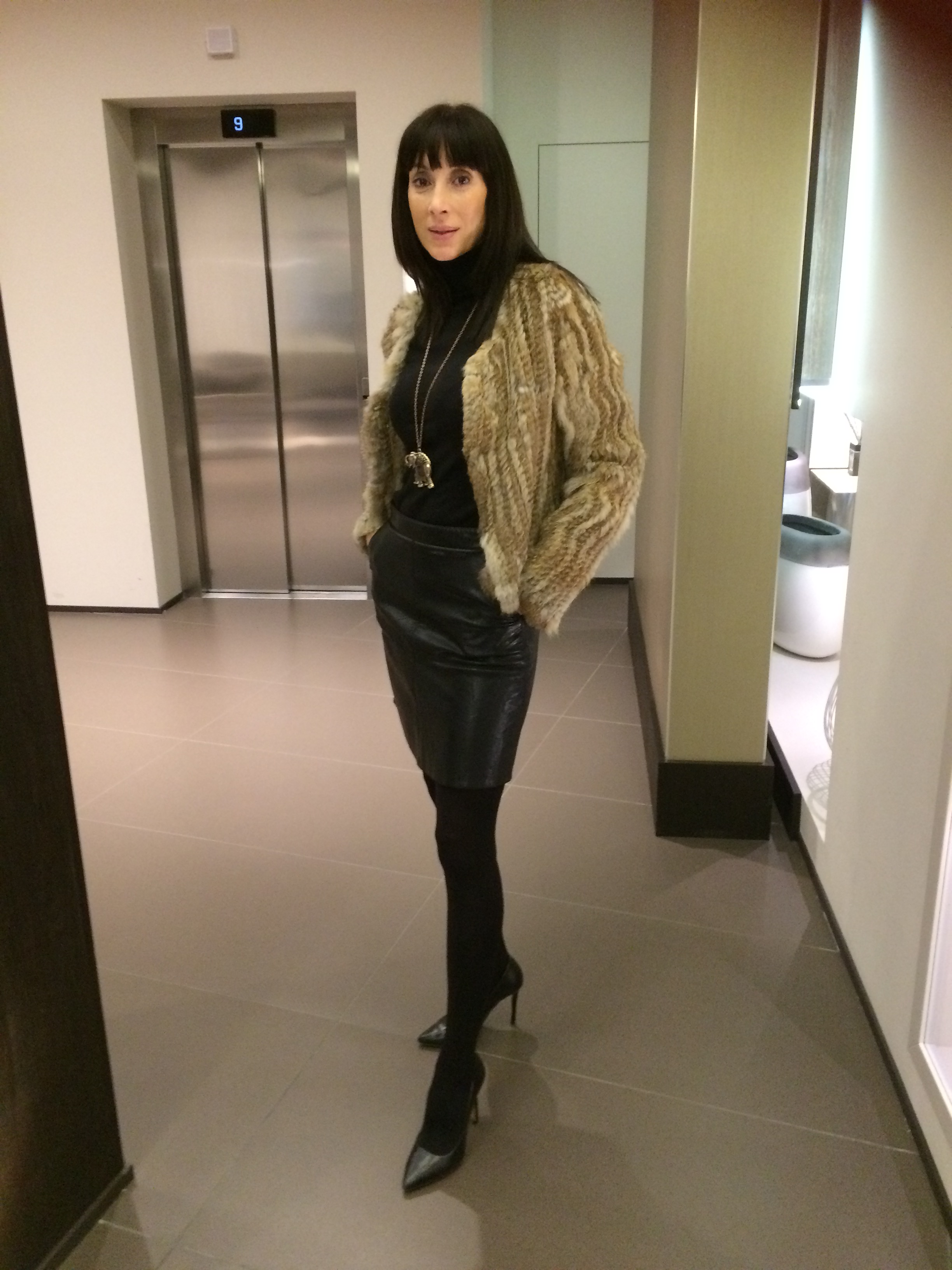 Esa mezcla entre el pelo de la chaqueta y la piel de la falda le dan un gran toque de elegancia para acudir a los eventos que tenia programados ese día.