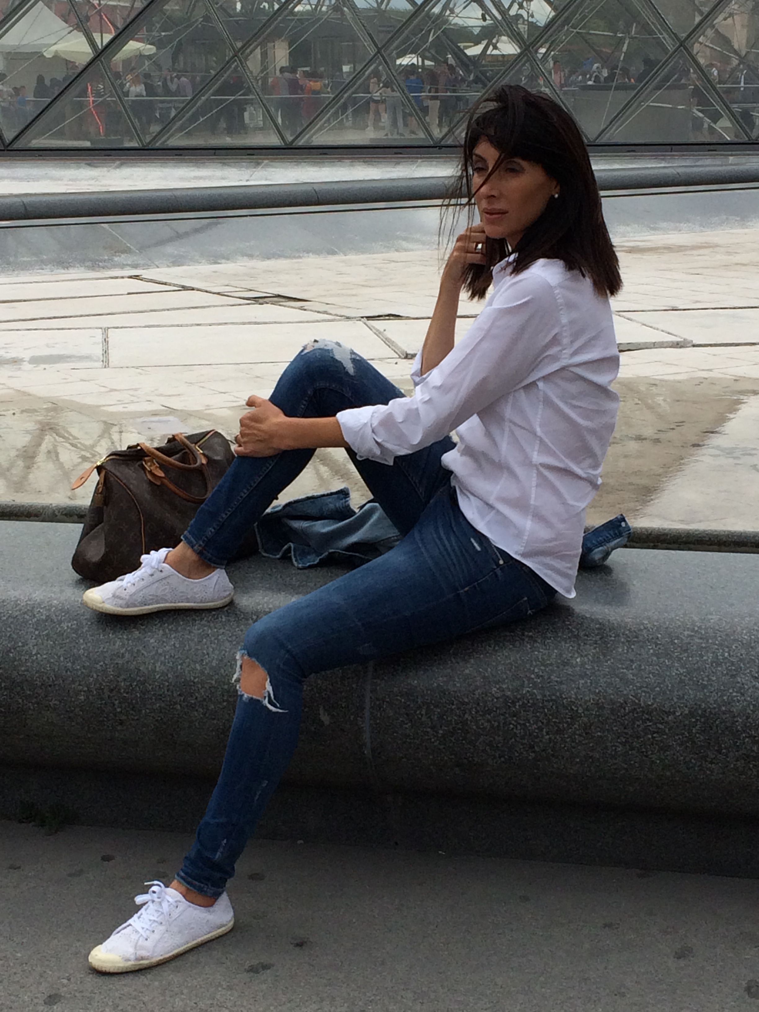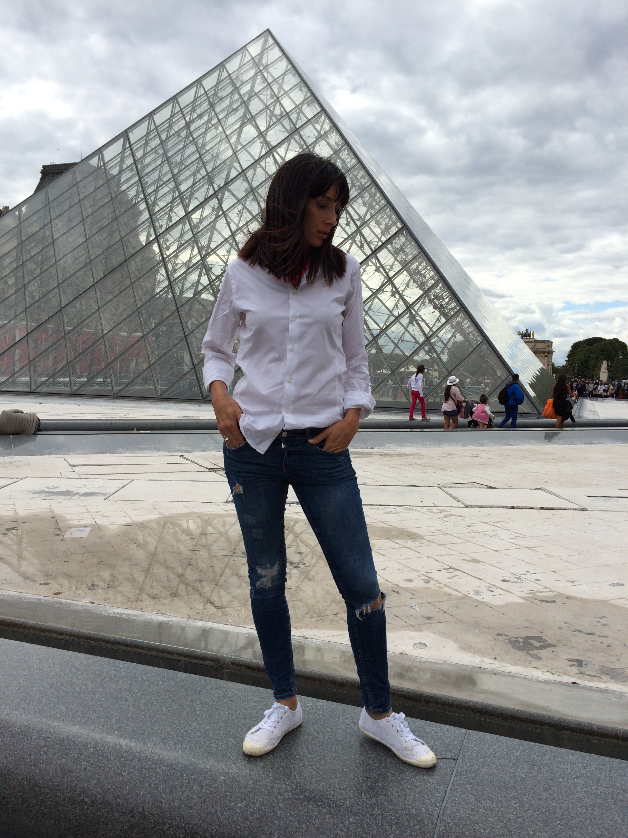 Os hablé de París en el anterior post, hoy os enseño el look utilizado. ¿No os ha pasado nunca que tenéis previstos todos los outfits de las vacaciones y cambia el tiempo? Pues eso me paso a mí. Pensar verano, hace calor, me llevo esto y esto y estos zapatos y una chaqueta por si hace fresquito, pero el fresquito se convirtió en frío. Solución unos jeans, camisa blanca tomada prestada a mi marido y una cazadora vaquera, básicos que nunca fallan, y unas zapatillas para caminar.